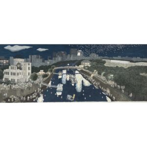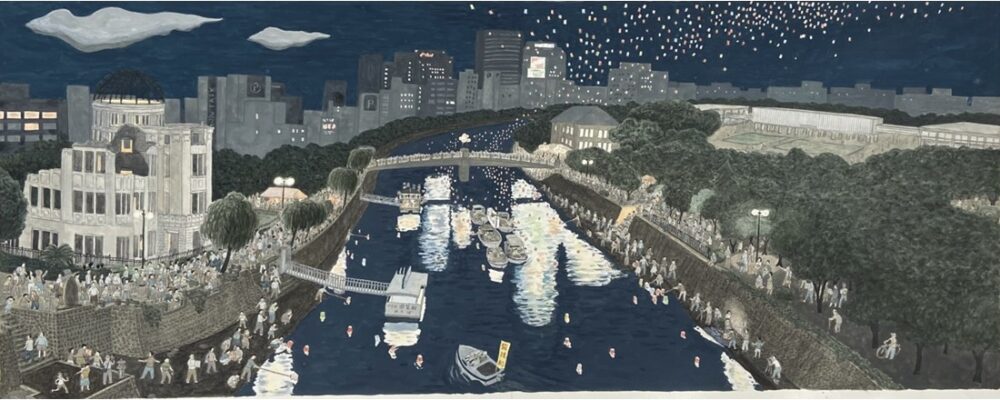 『絵で読む広島の原爆』では、1940年から被爆後50年までの広島の町並みとくらしが、少し高い位置から見下ろすように描かれています。原画からは、人々の生活のようすや科学的にとらえられた原爆の実情を克明に読み取ることができます。