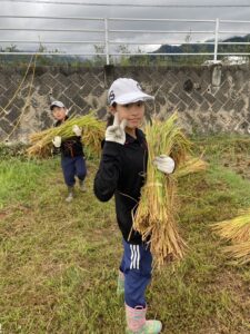 前日の雨で稲穂が重く、稲をかき分けながらの収穫となりました。