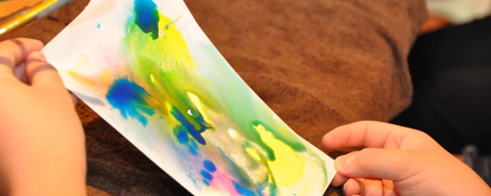 いわさきちひろが得意としていた水彩技法の「にじみ」を体験し、好きな部分を切り抜いて、しおりと缶バッジをつくります。