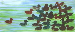 『トリとボク』(図2)は、主人公のボクだけが知っているひみつが語られる物語。家の近くの川にいるトリたちが、夕方になると身を寄せ合い、ゾウやクジラを形づくります。川をのぞき見るボクの視点で静かに展開する絵本です。「いつも生理的に心地よいものを求めてるんだけど、その心地よさが、ある時には抒情のほうに行くこともあるし、めちゃくちゃなほうに行く時もあるし」*2と語っています。このほか、絵日記形式で語られる『くもの日記ちょう』など、豊かな情感をたたえた絵本も紹介します。