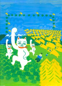 キャベツくんとブタヤマさんが道で出会い、奇想天外な出来事に遭遇する『キャベツくん』シリーズからは2 冊を出品します。『キャベツくんのにちようび』(図1)では、ふたりが巨大な招きねこに誘われてついていくと……、頁をめくるたびに、招きねこやぶたに埋め尽くされた場面が現れます。次は何がどのような形で登場するのか、常識にとらわれない展開に期待がふくらむ絵本です。