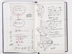 長がアイディアや絵本のダミーをつくる前の場面展開などを描き留めていた手帳(図5)が、当館に13冊保管されています。いずれも片手に乗るサイズで、出版社名などが入ったシステム手帳です。