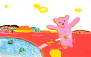 『トリとボク』では、1 冊を通して緑を基調に描かれていますが、黄色がかった緑や青味の強い緑など、場面ごとに色を変え、刻々と変化する夕暮れ時の光を表しています。反射する水面や暗がりで光る鳥の羽には透明水彩を使い透明感のある奥深い色を表現するなど、緑の色幅が美しい作品です。また、『くまさんのおなか』(図3)では、薄いクリーム色を下地に塗り、ピンクの発色を際立たせています。絵としての心地よさを追求した細やかな配慮を見ることができます。