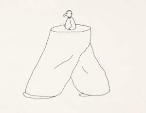 絵本には、大きな手の猫に「ギューッ ギュー」とにぎられて頭がおにぎりになったテングザルや、体の一部がキャベツになった巨大なクジラなど、一目見たら忘れられないいきものが登場します。漫画やカットでは、ひとりで外出するお尻や歩く下半身(図4)も。万物に生命が宿る「アニミズム」について、「僕の場合、根っこの部分にそれが強くあるんですよ。だから、そのへんの石ころひとつにしても何にしても、みんな命がある、精霊が宿っているという考え方で、絵の発想もぜんぶそこから出てくる。それにユーモアをプラスするわけ」*3と語っています。アニミズムを根源に生まれた不思議ないきものを多数出品します。