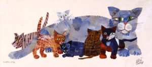 『ぼくのねこみなかった?』は男の子が大切にしていた猫を探すため、世界中を巡る絵本。紹介する作品(図1)は、探していた猫が見つかった最後の場面をもとに描かれました。エリック・カール(アメリカ)は、自ら模様を手描きした色とりどりの薄紙を大量にストックし、そのなかから絵に合わせて選んだ紙を切り貼りして、作品をつくりました。“ ぼくの猫” が連れているたくさんの子猫を、二つと同じ模様のないオリジナルの薄紙で描き分けています。