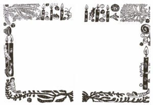 茂田井武が挿し絵を描いた小川未明の童話集『月夜とめがね』では、本文を囲む10種類の飾り罫が描かれています。「赤いろうそくと人魚」の飾り罫(図3)では、ろうそくや海藻、人魚など登場するモチーフがデザインされ物語を伝えています。