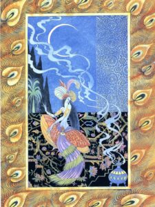縁飾りが印象的な絵本もあります。エロール・ル・カイン(イギリス)の『アラジンと魔法のランプ』では、各場面に豪華な縁飾りが施されています。右の作品(図2)の、大胆に並ぶクジャクの羽はエキゾチックな雰囲気で、見るものを異世界に誘います。