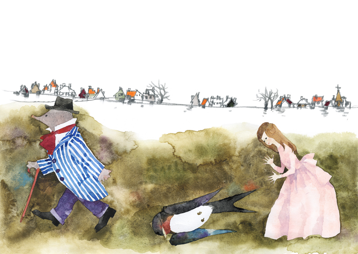 作品:いわさきちひろ『おやゆびひめ』(講談社)より もぐらとけがをしたつばめを見つけたおやゆび姫、1966年 (ちひろ いつもとなりに―子どもと動物― にてピエゾグラフにて展示中)