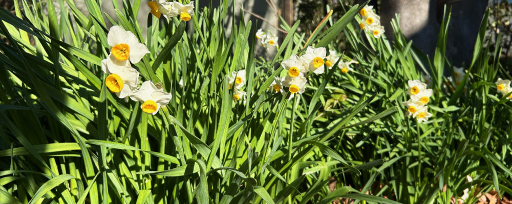 越前水仙は、日本海の荒波が打ち寄せる越前海岸にせり出す山々に咲き、雪が積もっても折れることなく、また起き上がるといわれています。いわさきちひろ生誕の地、福井県(武生、現・越前市)より2009年に贈られ、毎年高い香りとともに美しい姿を見せてくれています。