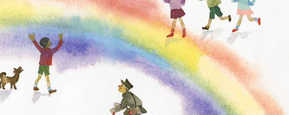 いわさきちひろ 大きな虹と子どもたちと働く人々(部分) 1960年代前半