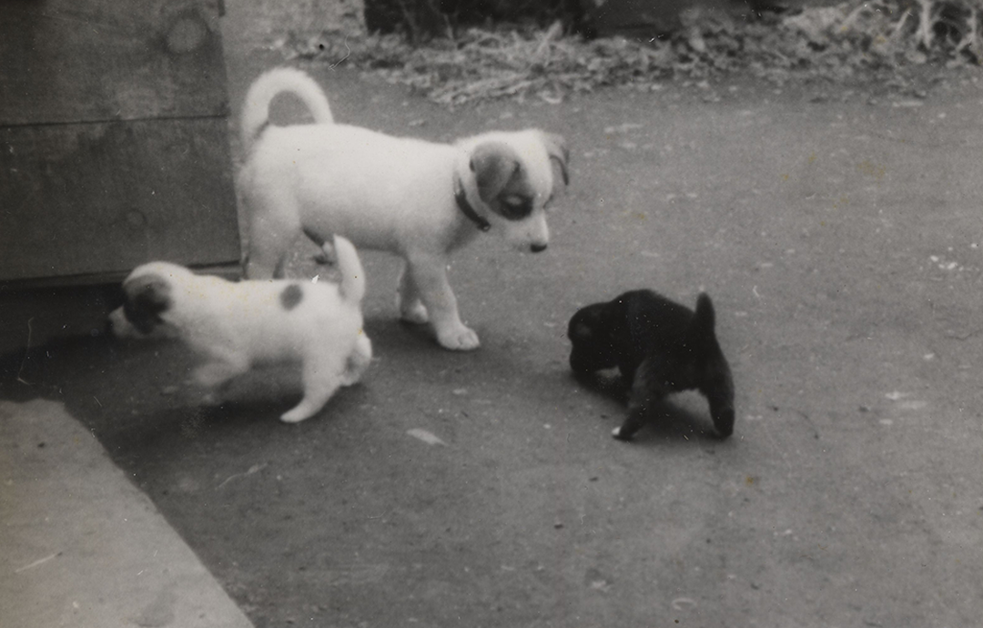 ②イチ:パッピーの死後、1959年8月に画家の丸木位里・俊夫妻から譲り受けた、2代目の飼い犬です。ともに暮らした期間は1年ほどと短く、写真もあまり残っていませんが、短い足とかわいらしい顔が印象的な小型犬でした。(写真・中央がイチ)