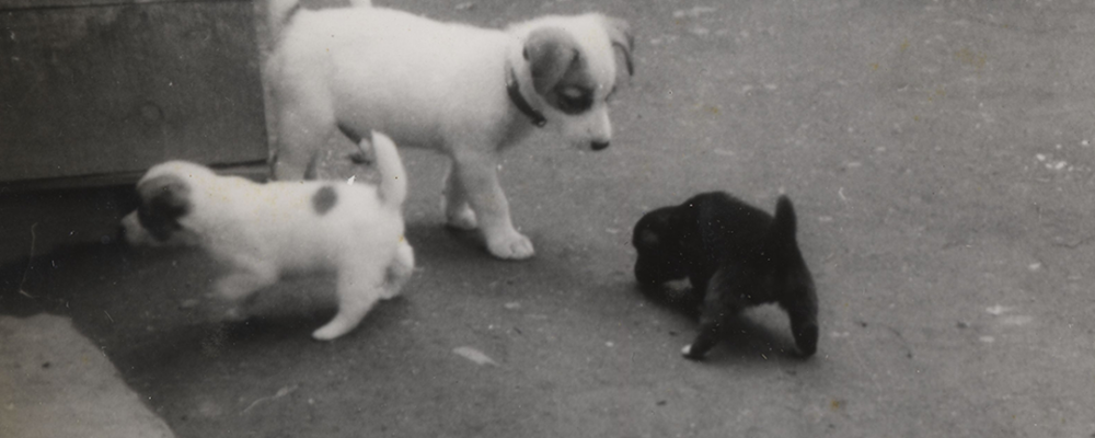 ②イチ:パッピーの死後、1959年8月に画家の丸木位里・俊夫妻から譲り受けた、2代目の飼い犬です。ともに暮らした期間は1年ほどと短く、写真もあまり残っていませんが、短い足とかわいらしい顔が印象的な小型犬でした。(写真・中央がイチ)