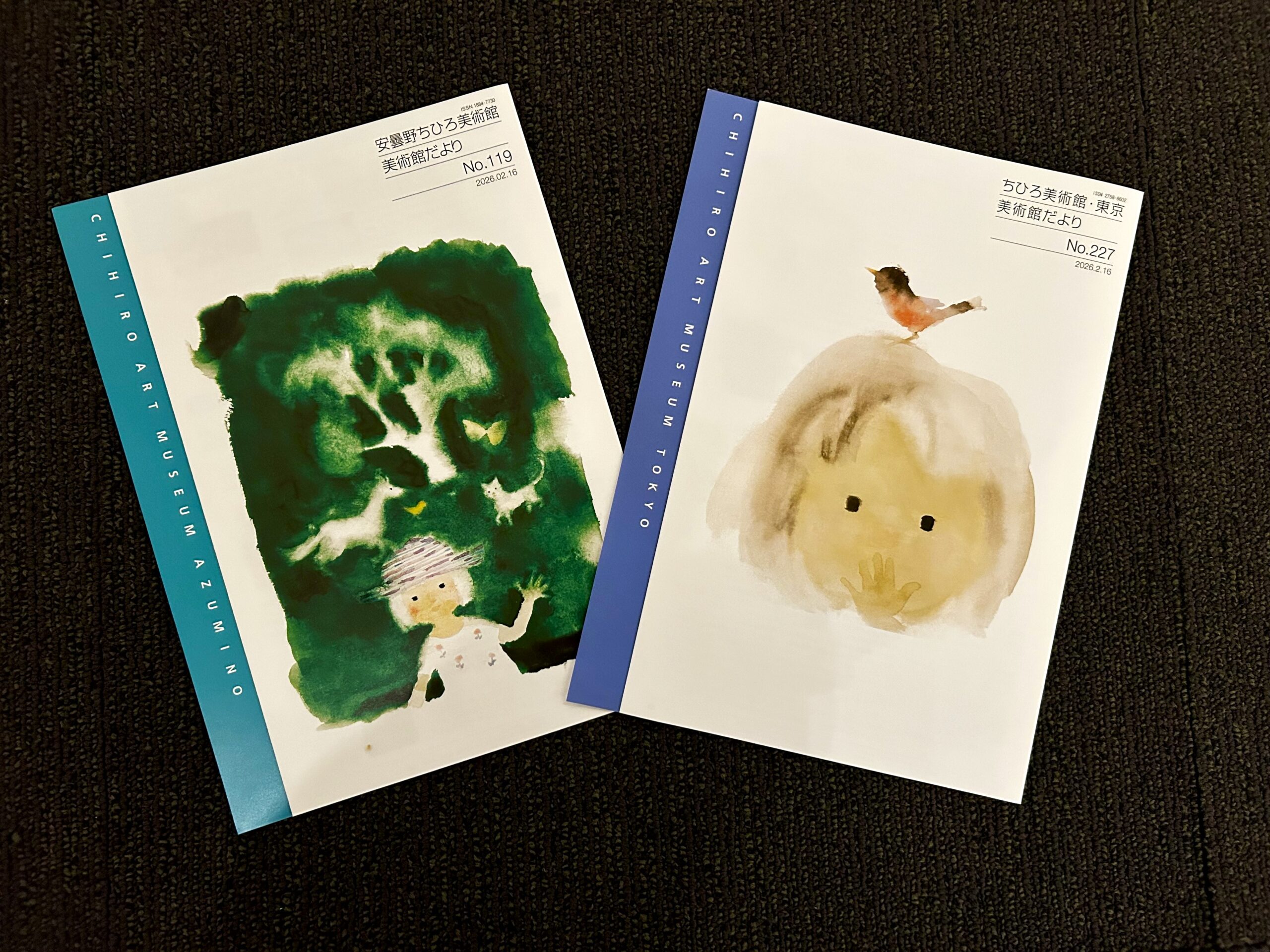 ちひろ美術館では、展覧会の開幕にあわせて、1年間に3~4回、東京と安曇野それぞれの館で「美術館だより」を発行しています。展示紹介はもちろん、イベントなどの活動報告や、館内に設置している感想ノート「ひとことふたことみこと」の抜粋、美術館スタッフによる日記など、ちひろ美術館の活動を幅広くまとめた内容です。開幕前の展覧会の見どころや、新収蔵作品のお披露目など、最新情報をいち早くお知らせする場でもあります。