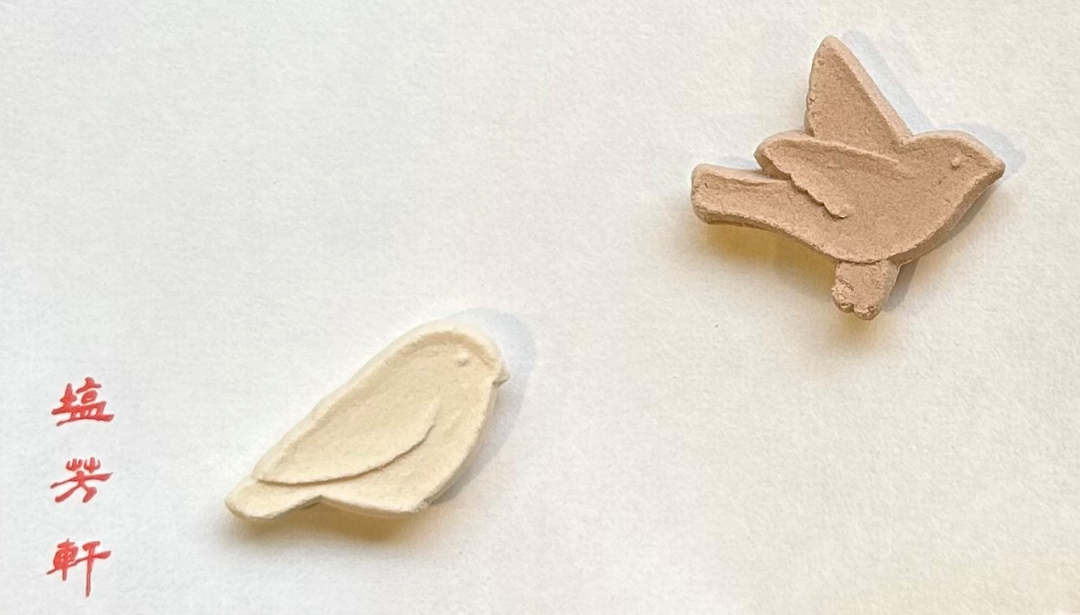 塩芳軒が今回のために特別につくった、鳥がモチーフのお干菓子と、オリジナル煎茶のセット。