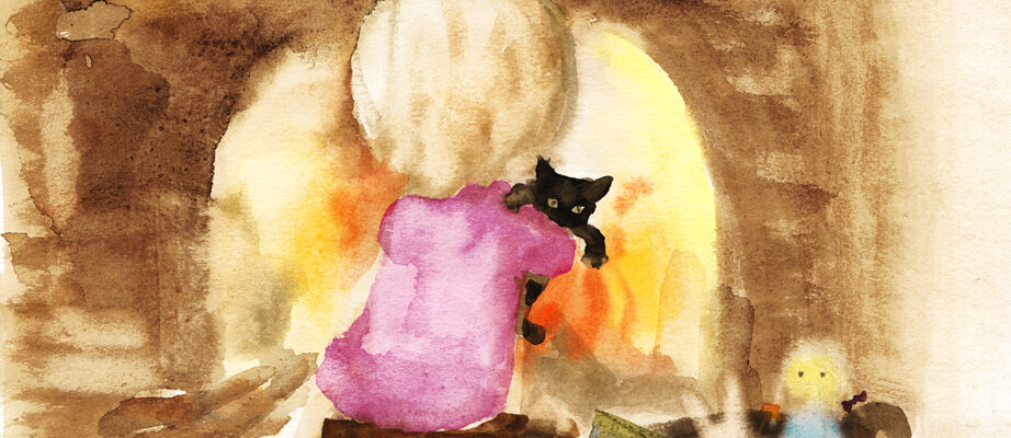 いわさきちひろは、子どものころから結婚するまで絶えず猫を飼っていました。ちひろが名前をつけた「八千代」、「おさき」、「リリー」、「タンポポ」、さらには「バモ」、「オバーモ」など。猫の動きや生態を近くで観察した経験は、のちの作品にも活きています。たとえば、《暖炉の前で猫を抱く少女》に描かれた猫は、黒猫「おさき」がモデルとされています。女の子のセーターに爪を立て、画面手前の毛糸玉をじっと見る猫の表情が、なんともかわいらしいですね。