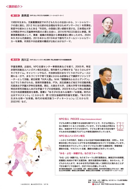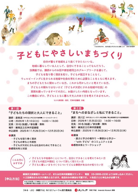 ちひろ美術館・東京が中核館をつとめる「みる・よむ・体験する」ねりまフォーラムでは、NPO法人PIECESをコーディネーターとした講座「子どもにやさしいまちづくり」を開催します。