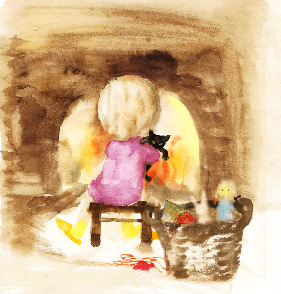 いわさきちひろ 暖炉の前で猫を抱く少女 1971年
